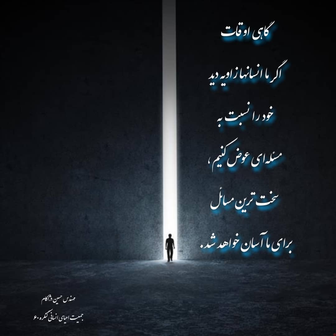 گاهی اوقات اگر ما انسانها زاویه دید خود را نسبت به مسئلهای عوض کنیم، سختترین مسائل برای ما آسان خواهد شد. و بالعکس، اگر زاویه دید خود را نسبت به مسئلهای سخت کنیم؛ آسانترین مسائل برای ما خیلی سخت میشود.