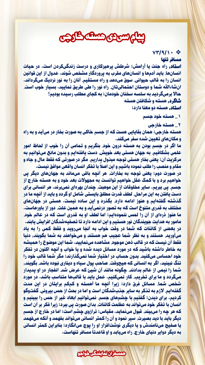 یک مسافر تنها بهصورت عام و یکی در خواص داریم. ما با چشم، فقط یک محدوده را میتوانیم، ببینیم. بعضی اوقات، ترازوی ما چشم ما است. در جهان خواب، دنیای آخرت و محیطهای دیگر را باید با دید دیگری سیر کنیم و کمتر انسانی به ابعاد خارج از جسم پی میبرد و آنکسی که متوجه میشود؛ اگر حفظ نکند و آشکار کند؛ یا او را دیوانه و نادان میپندارند یا نوشتههایش را پوچ میانگارند.