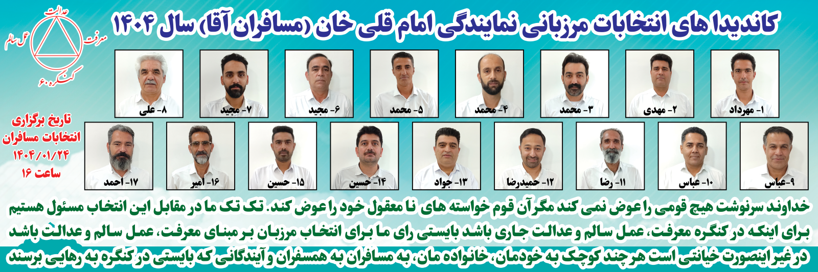 خداوند سرنوشت هیچ قومی را عوض نمیکند، مگر آن قوم خواستههای نامعقول خود را اصلاح نمایند. تکتک ما در مقابل این انتخابات مسئول هستیم. برای اینکه در کنگره، معرفت، عمل سالم و عدالت جاری باشد، بایستی رأی ما برای انتخاب مرزبان بر مبنای معرفت و عمل سالم و عدالت باشد. در غیر این صورت خیانتی است هرچند کوچک به خودمان، خانوادهمان، به مسافران، به همسفران و آیندگانی که بایستی در کنگره به رهایی برسند. "نگهبان کنگره ۶۰"