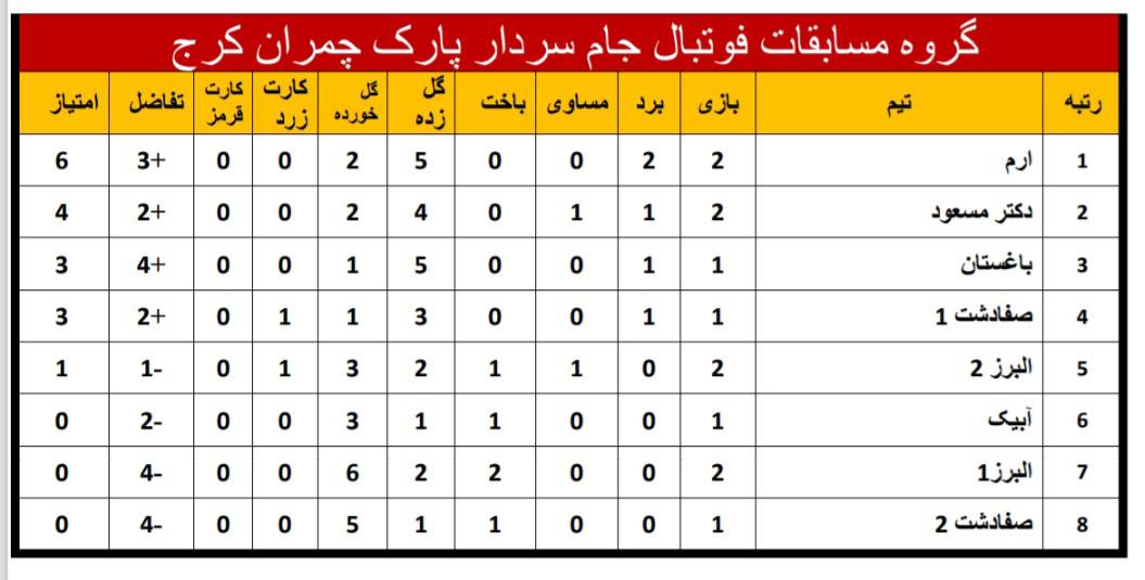 نتایج و جدول ردهبندی فوتبال جام سردار پارک چمران؛