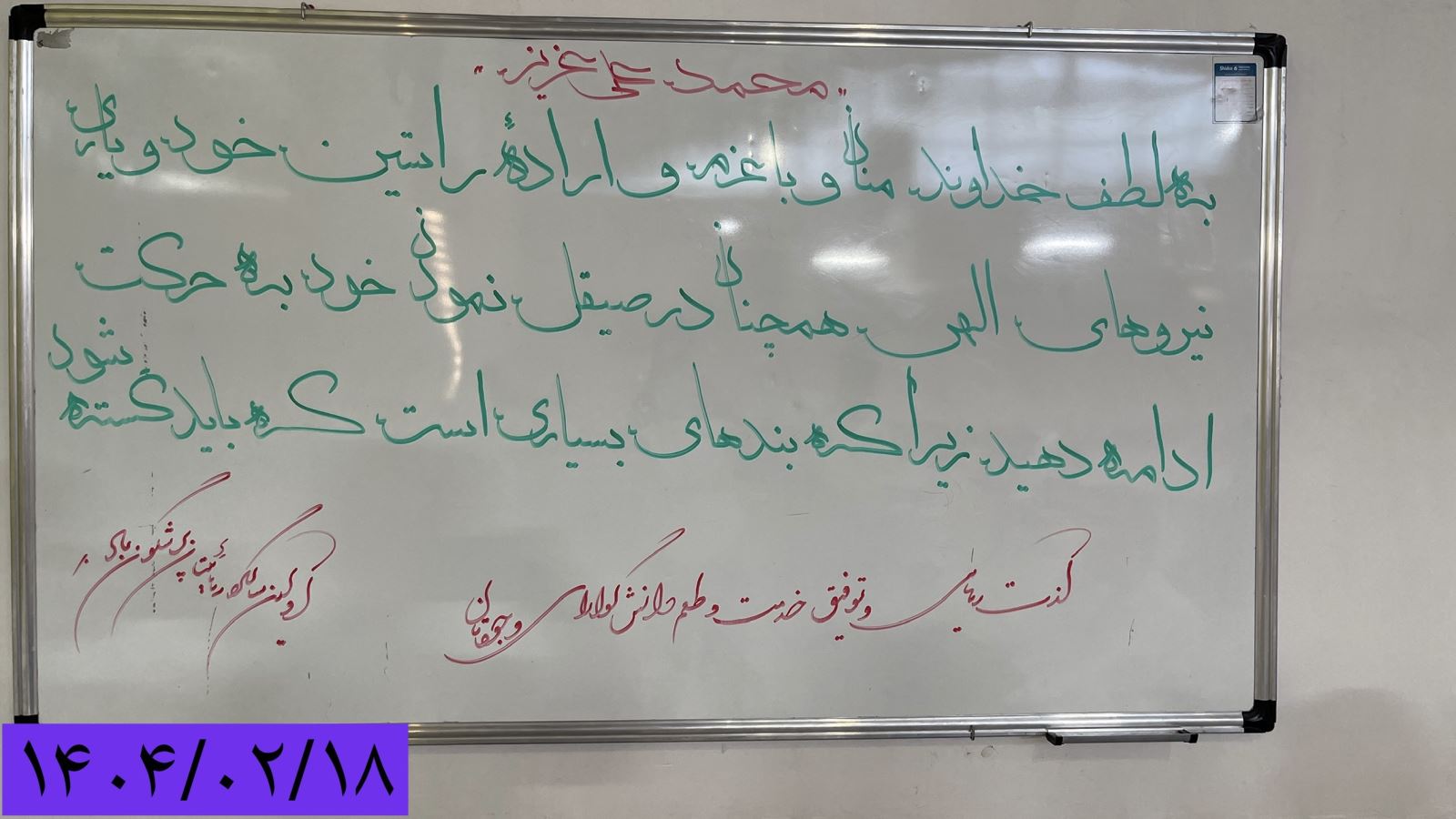 دوازدهمین جلسه از دوره بیست و هشتم سری کارگاههای آموزشی عمومی کنگره 60 ویژه مسافران و همسفران نمایندگی عطار نیشابوری در روزهای پنجشنبه با استادی: راهنمای محترم مسافر ابوالفضل، نگهبانی: مسافر احمد، دبیری: مسافر حسین و دستور جلسه «جهانبینی ۱ و ۲ و جشن تولد یک سال رهایی مسافر محمدعلی» در تاریخ ۱۴٠۴/٠۲/۱۸ ساعت ۱۶: ۳۰ دقیقه آغاز به کار نمود.