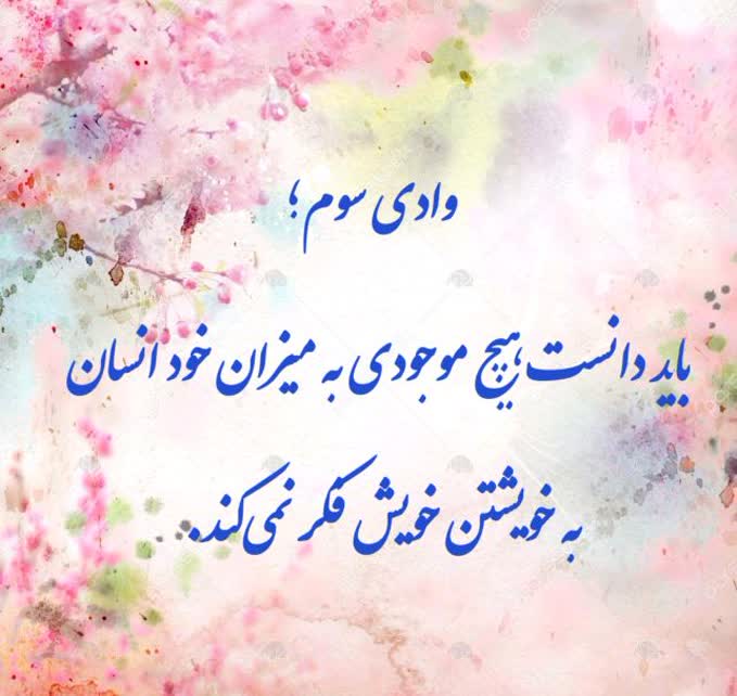در طول تاریخ این تفکر بهوجود آمده که شاید دیگران بتوانند بیشتر از خود ما به ما کمک کنند؛ ولی در وادی سوم این قانون وجود دارد؛ که مهم نیست ما آنرا بپذیریم یا نه؛ بلکه این یک حقیقت است: هیچ موجودی به میزان خود انسان، به خویشتن خویش فکر نمیکند.