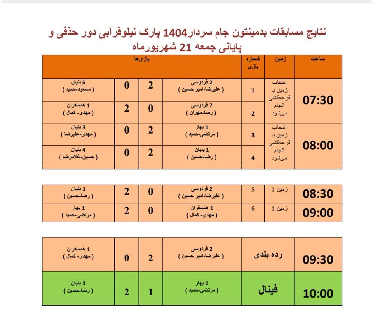 روز جمعه ۲۱ شهریور ماه دور حذفی و پایانی مسابقات بدمینتون جام سردار ۱۴۰۴ در پارک نیلوفرآبی برگزار و تیمهای برتر این مسابقات مشخص شدند.