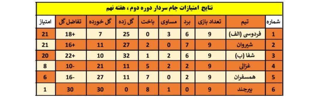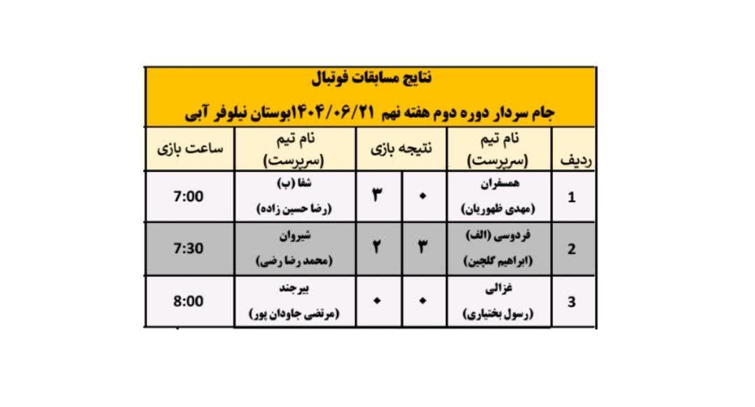 در تاریخ 21 شهریور ماه هفته نهم از دور دوم مسابقات فوتبال جام سردار ۱۴۰۴ با انجام 3 بازی پیگیری و نتایج زیر بدست آمد.