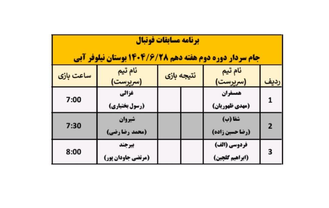 برنامه بازی های روز جمعه 28 شهریور طبق جدول زیر میباشد.