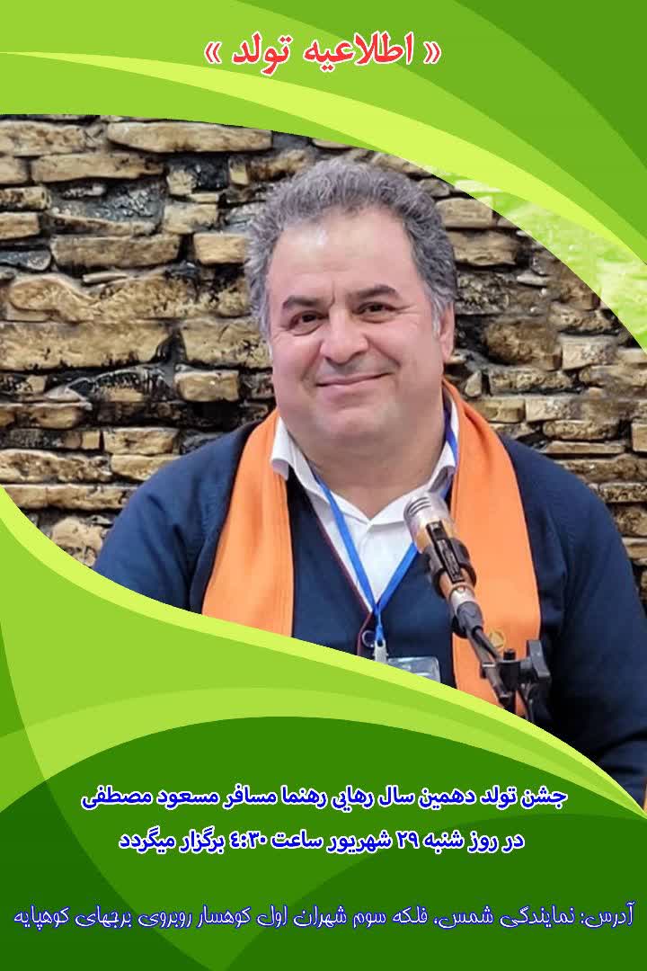 به اطلاع مسافران و همسفران گرامی میرساند جشن تولد دهمین سال رهایی راهنمای محترم مسافر مسعود روز شنبه مورخ 29 شهریور ۱۴۰۴ رأس ساعت ۱۶/۳۰ در نمایندگی شمس برگزار میگردد.