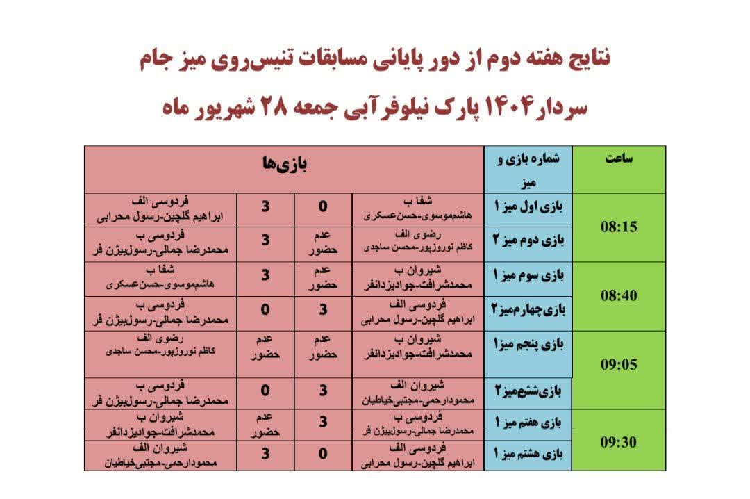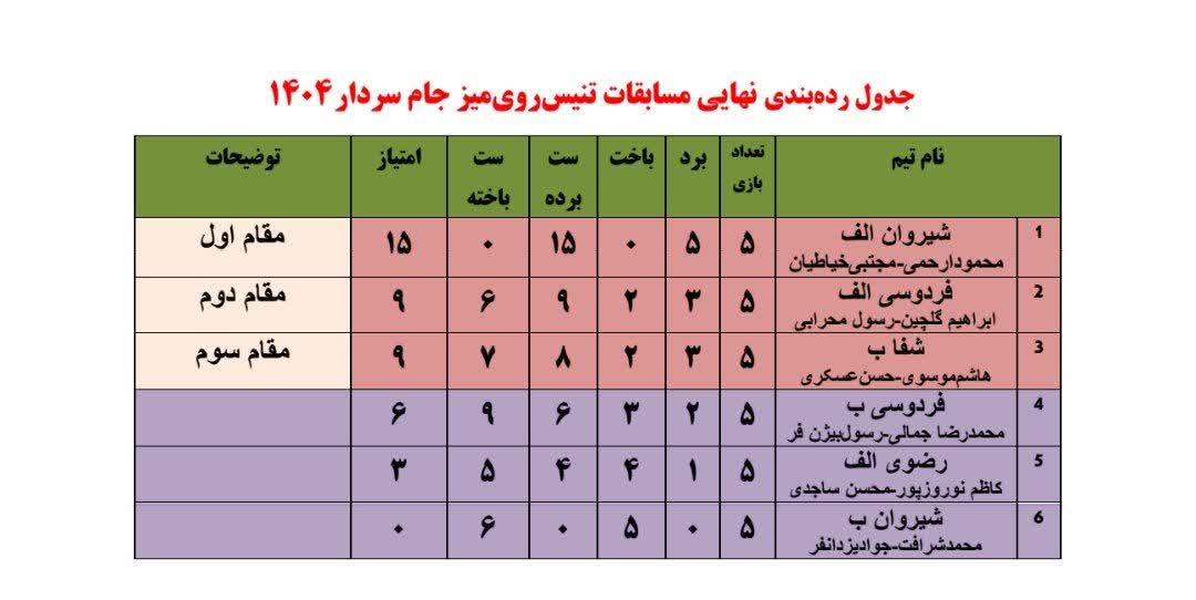 هفته آخر مسابقات تنیسرویمیز جام سردار با انجام 8 دیدار به اتمام رسید و تیم شیروان الف با اقتدار به مقام اول دست پیدا کرد.