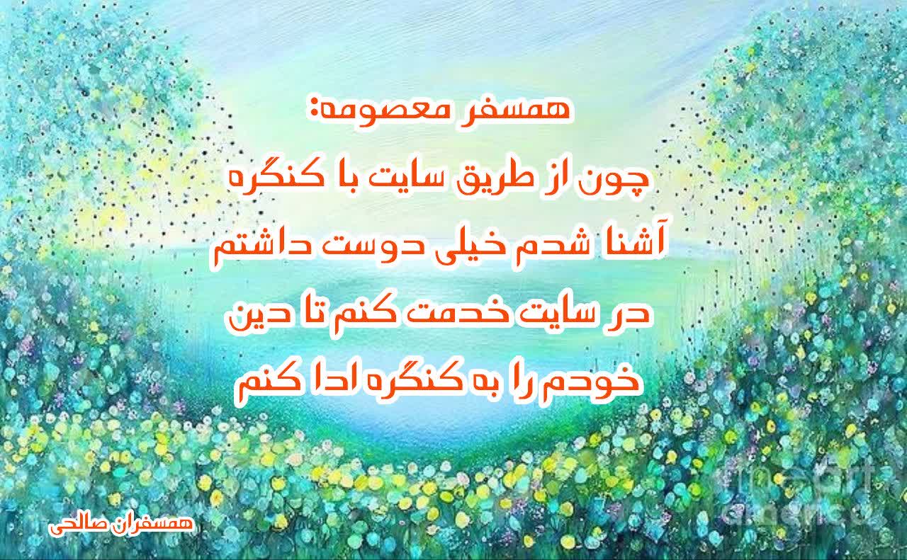 ابتدا خداوند را بسیار شکر میکنم که عضو کوچکی از این خانواده بزرگ هستم. اولین خدمتی که در کنگره۶۰ روزی من شد، خدمت زیبای سایت بود. خدمت در این جایگاه فرصت خوبی بود تا بتوانم از مطالب متنوع سایت برای حل مسائل و مشکلاتم استفاده کنم. مقالهها، دلنوشتهها و مصاحبهها هر کدام بار آموزشی بسیاری برای من دارند.