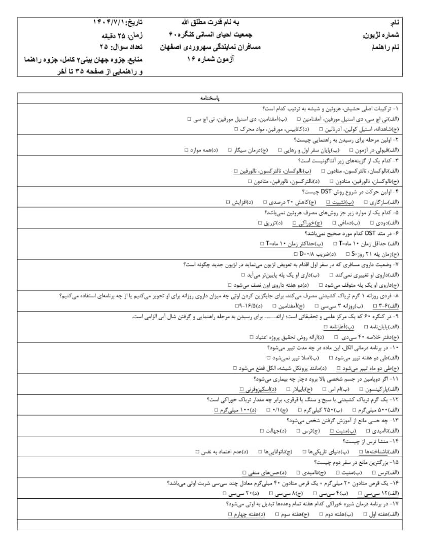 دانش اعتیاد پاسخنامه آزمون منبع: نمایندگی سهروردی جمعه 4 مهر 1404 تعداد بازدید از این مطلب : 174 منبع: نمایندگی سهروردی جمعه 4 مهر 1404 تعداد بازدید از این مطلب : 174 ویژه ها مقاله "تأثیرات رفتاری و مولکولی پروتکل دی اس تی بر مدل حیوانی اعتیاد به تریاک" از مهندس حسین دژاکام، درصدر محافل علمی دنیا مورد بررسی و پذیرش قرار گر ارائه مقاله جدید و برجسته مهندس حسین دژاکام در حوزه درمان اعتیاد با روش DST با دقت سلولی مولکولی در کنفرانس بین المللی درمان اعتیاد در اورلاندو، فلوری دستاورد شگفتآور دیگری از تیم تحقیقاتی کنگره 60 در ریسرچ گیت منتشر گردید. دستاورد شگفت آور دیگری از کنگره 60، انتشار مقاله مهار متاستاز سرطان سینه به صورت short communication رویکردی نوین در درمان سرطان گواهی ارائه مقاله "تاثیر روش دی اس تی بر درمان زخمهای بیماری کولیت اولسراتیو" در سمپوزیوم ایمونولوژی 2024 ایلینوی، امریکا چاپ يافته هاي جديد كنگره 60 در مورد تاثير ديسپ بر كويد 19 سمپوزیم سرطان پستان (سن آنتونیو، تگزاس، امریکا، 19 خرداد تا دوم تیرماه 1403)