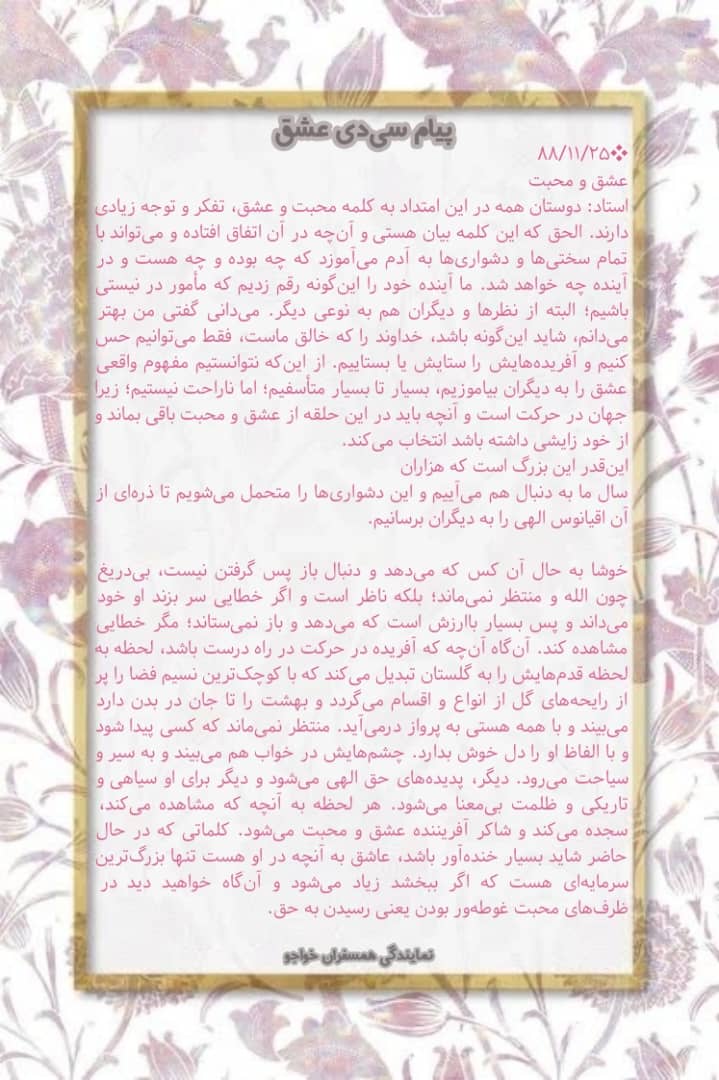 آقای مهندس دژاکام در سیدی «عشق» به این نکته اشاره میکنند که عشق بیشترین واژهای است که در مورد آن صحبت شده است. ایشان عشق را همچون بخاری در سرما و کولری در گرما توصیف میکنند که به انسان حیات میبخشد.