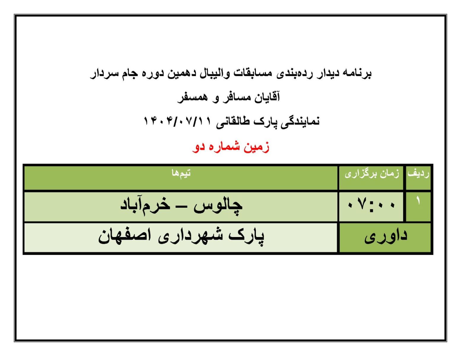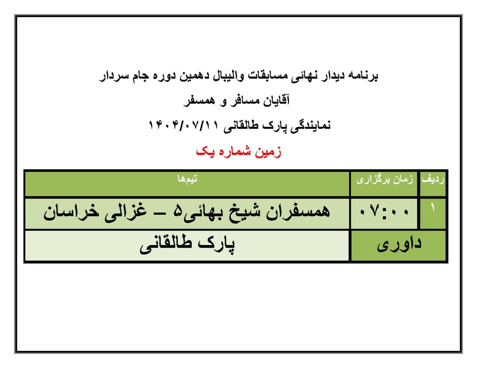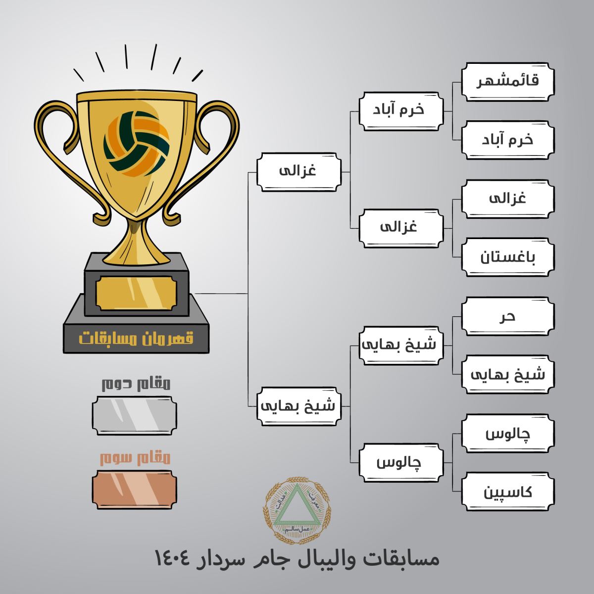 دیدار فینال روز جمعه ۱۴۰۴/۰۷/۱۱ رأس ساعت ۷ صبح در همان مکان برگزار خواهد شد و تیم غزالی به مصاف تیم همسفران شیخ بهایی میرود. این دیدار آخرین مسابقه از سری رقابتهای جام سردار است و سرنوشت قهرمان این دوره را مشخص خواهد کرد.