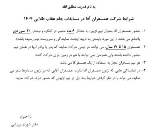 احتراماً به استحضار می‌رساند، با توجه به مصوبه و اعلام شورای محترم ورزشی جهت برگزاری مسابقات جام عقاب طلائی، تاریخ ثبت نام و ارائه فرم و مدارک مربوط به هفدهمین  دوره بازی‌های والیبال آقایان همسفر و مسافر در نمایندگی پارک نیلوفر آبی از تاریخ چهارم مهرماه سال جاری الی یازدهم مهرماه ۱۴۰۴ اعلام می‌گردد. لذا خواهشمند است پس از تهیه فرم و احراز تمام شرایط و قوانین مصوبه محترم شورای ورزشی نسبت به تکمیل و تحویل مدارک به ورزش‌بانان رشته ورزشی والیبال اقدام نمائید. لیست ثبت نام و قوانین مربوط به مسابقات در صفحه سایت کنگره۶۰ بارگزاری و در دسترس می‌باشد.