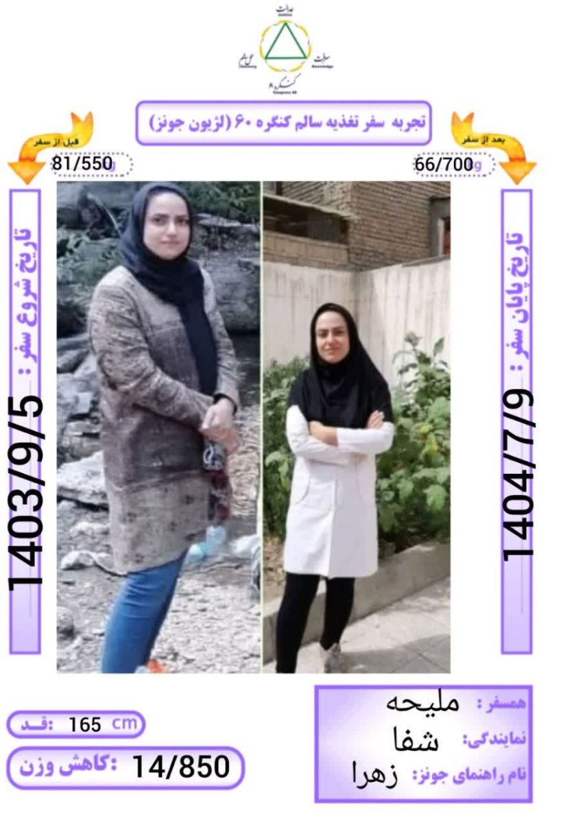 در روز چهارشنبه ۹ مهر ۱۴۰۴ همسفر ملیحه رهجوی راهنما همسفر زهرا نمایندگی شفا با قد ۱۶۵ و وزن اولیه ۸۱/۵۵۰ کیلوگرم به مدت ۱۰ ماه و ۴ روز به روش DST سفر کردند؛ ۱۴/۸۵۰ کیلوگرم کاهش وزن داشتند و به وزن ۶۶/۷۰۰ کیلوگرم رسیدند و با دستان پرتوان آقای مهندس آزاد و رها شدند.