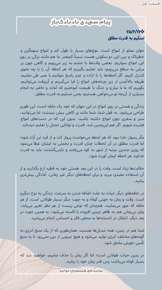این جهان سرشار از امواج است و ما انسانها مثل برگهایی هستیم که زندگی ما بر موجهای آن شکل میگیرد، گاهی بالا و پایین میرویم و اگر موجسواری بلد نباشیم، موج ما را خرد میکند. موجسواری، یعنی یاد گرفتن ارتباط درست با دیگران، یعنی این که در جهت رودخانه حرکت کنیم نه خلاف آن. اگر در صراط مستقیم باشیم، زندگی با ما همراه میشود؛ اما اگر در ضدارزشها باشیم از دور خارج میشویم مثل گردباد که اگر هماهنگ باشی، بالا میروی و اگر مقاومت کنی به بیرون پرت میشوی.