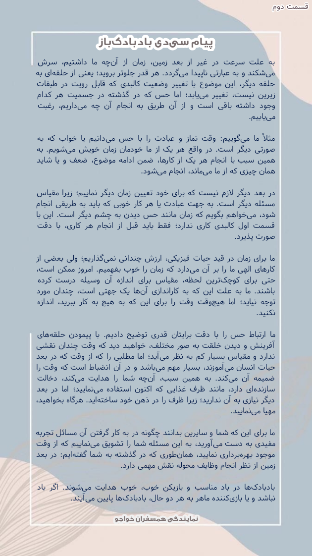 ما در زمین در حال تبدیل هستیم. در جهان هیچ انرژی از بین نمیرود و فقط تبدیل میشود؛ باید قدر زمان را بدانیم؛ زیرا زمان نقش بسیار سازندهای دارد. حسهایی که در این دنیا داریم، چه خوب و چه بد در بعد بعدی باقی میمانند.