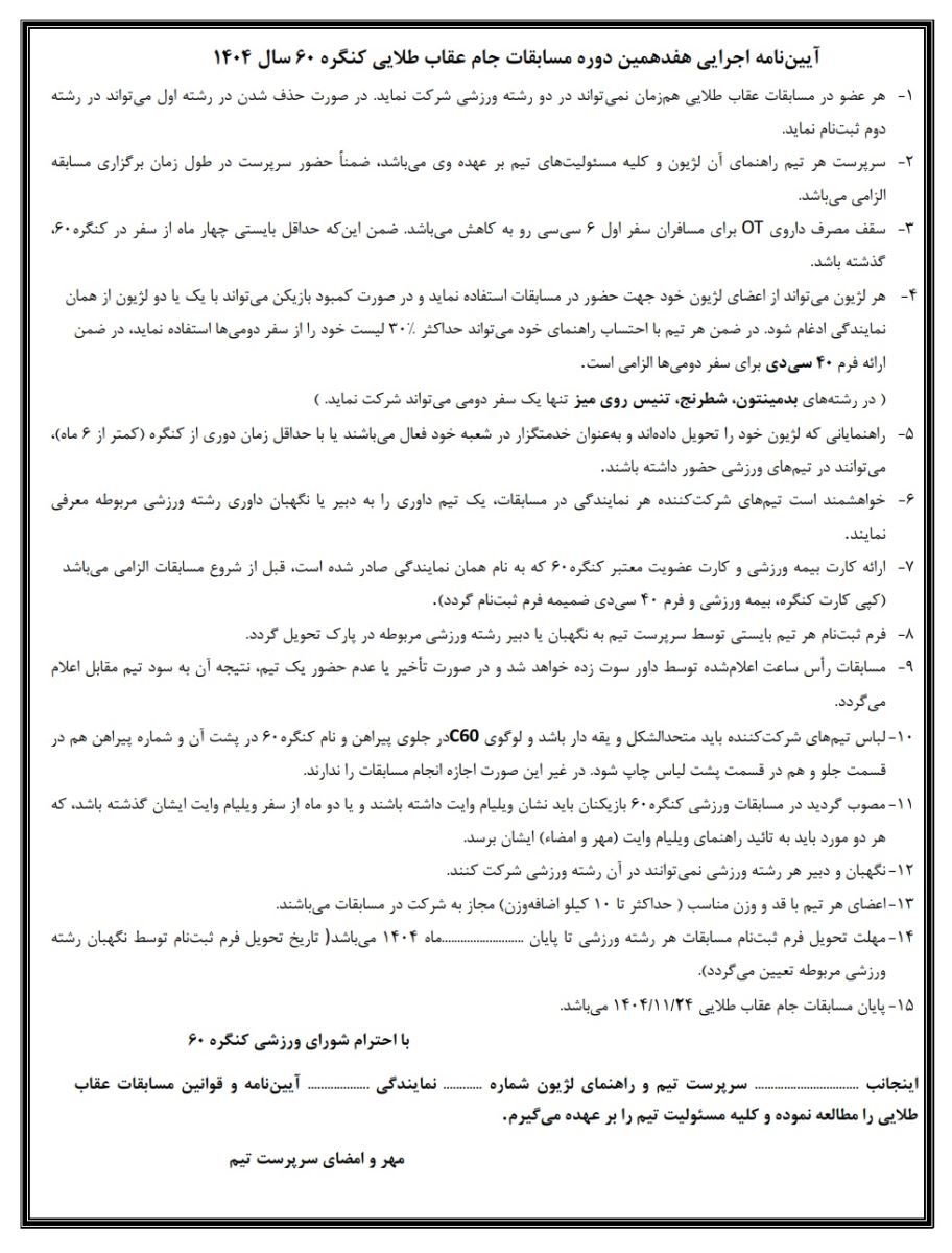 در ادامه آئیننامه اجرایی هفدهمین دوره مسابقات جام عقاب طلایی کنگره 60 سال 1404 و شرایط شرکت همسفران آقا در مسابقات جام عقاب طلایی 1404 را ملاحظه میکنید.