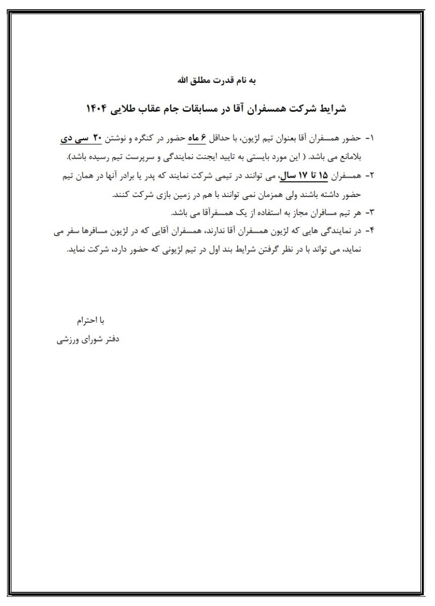 عزیزان نگهبان برای تهیه فرم ثبتنام جام عقاب طلایی لطفاً به اینجا مراجعه نمایند و با توجه به قوانین و شرايط شرکت کنندگان ثبت نام صورت بگیرد.