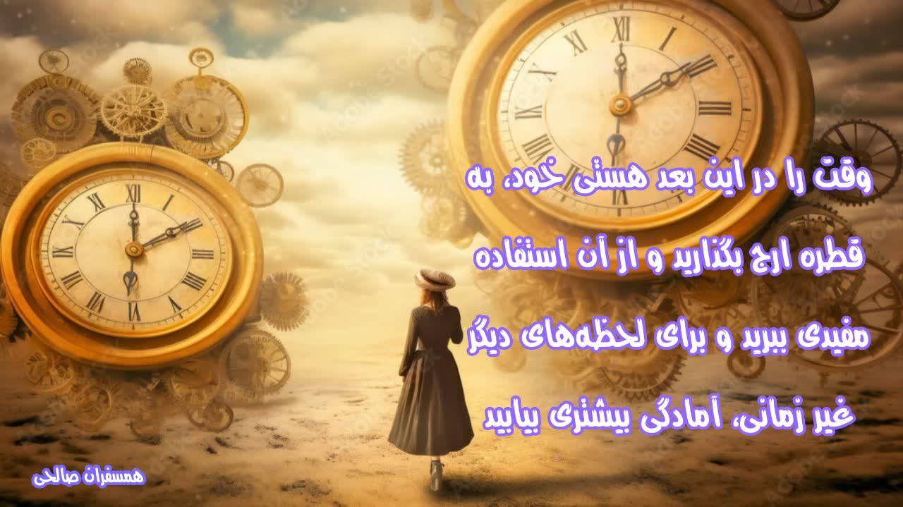 مثلا ما میگوییم وقت نماز و عبادت با حس میدانیم و یا خواب که به صورتی دیگر است؛ در واقع هر یک از ما خودمان زمان خویش میشویم و همین سبب با انجام هر یک از کارها ضمن ادامه، موضوع ضبط و یا شاید همان چیزی که از ما میماند، انجام میشود. در بعد دیگر لازم نیست که برای خود تعیین زمان دیگری نماییم؛ زیرا مقیاس مسئله دیگر است به جهت عبادت یا هر کار خوبی که باید به طریقی انجام شود؛ میخواهم بگویم زمان مانند حس دیدن به چشم دیگر است و این با قسمت اول کالبد کار ندارد، فقط باید قبل از انجام هر کاری با دقت صورت پذیرد.