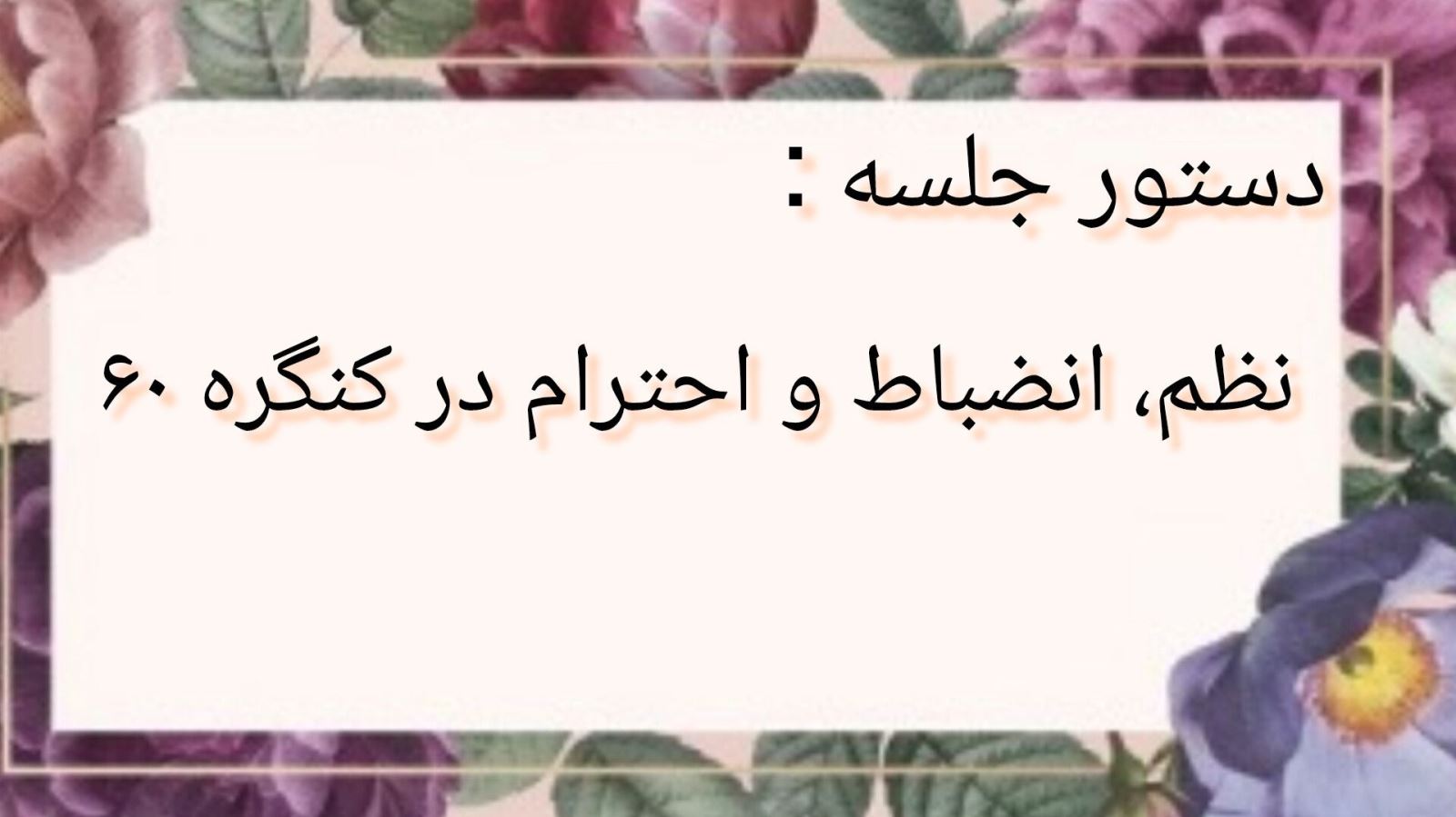 اگر خوب دقت کنیم، خواهیم دید تمام هستی بر پایه نظم و انضباط بناشده است از گردش منظم زمین به دور خورشید تا نظم مثالزدنی بدن انسان و حتی کوچکترین عضو بدن یعنی سلول بسیار منظم میباشند، کوچکترین بینظمی میتواند این سیستم جسم را از تعادل خارج کند. کنگره60 نیز بر اصل جهان طبیعت بناشده است و به ما یاد میدهد چگونه منظم باشیم. انضباط به معنای اجرای نظم در عمل میباشد و باید تمام امورات خود را با نظم انجام دهیم حتی اگر سخت باشد. احترام حلقه طلایی بین نظم و انضباط میباشد کسی که منظم است به دیگران بیاحترامی نمیکند و اجازه نمیدهد که احساسات و افکار منفی او را از صراط مستقیم خارج کند. کنگره60 به ما آموزش داد احترام فقط به گفتار نیست بلکه باید در رفتار،گفتار، نگاه و حتی سکوت ما جاری باشد.