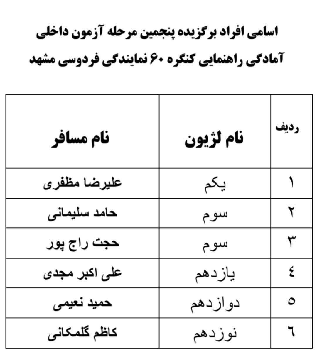 با عرض سلام و ادب واحترام ، به استحضار می رساند پنجمین مرحله آمادگی آزمون راهنمایی کنگره ۶۰ در نمایندگی فردوسی در روز پنج شنبه 17 مهر ماه ۱۴۰۴ با حضور پر رنگ و فعال مسافران علاقمند برگزار گردید که نتایج آن به شرح زیر به حضورتان ارسال می گردد.