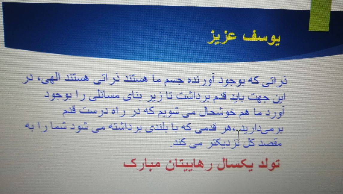 همانطور که میدانید این هفته دستور جلسه در مورد وادی هشتم است که با حرکت راه نمایان میشود، و این راه بسیار مهم است که راهی مستقیم باشد که در کنگره وجود دارد و اون موقع است که حرکت کردن باعث آبادانی میشود و این برای خانم طاهره عزیز رقم خورده است که امروز شاهد این تولد هستیم.