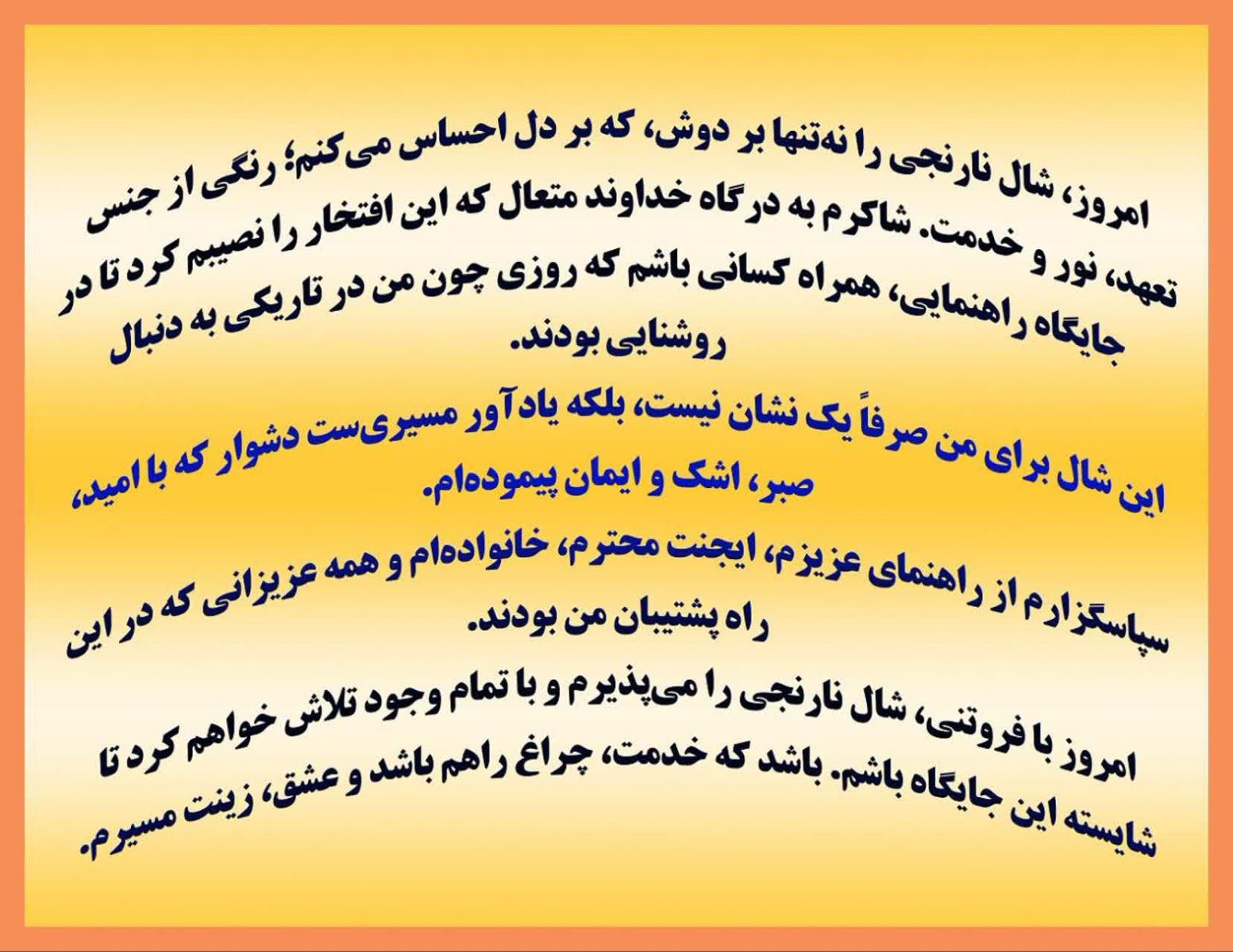 با افتخار،دریافت شال راهنمایی مسافر علی اصغر از دستان جناب مهندس دژاکام را به خود علی اصغر عزیز، راهنمای گرانقدرش مسافر محمد ضیائی، تمامی خدمتگذاران ، مسافران و همسفران نمایندگی صفادشت تبریک میگوییم. این شال، نشان از تعهد و مسئولیتپذیری شما در مسیر رهایی و خدمت به دیگران است. آرزومندیم در این راه، موفق و سربلند باشید.