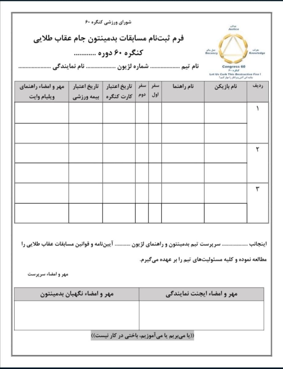 فرم ثبتنام مسابقات بدمینتون جام عقاب طلایی: