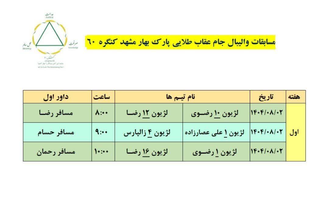 روز جمعه ۲۵ مهر ماه، قرعهکشی مسابقات والیبال پارک بهار با حضور نگهبان ورزش والیبال استان خراسان مسافر محمود تلگردی، مرزبانان ورزشی و سرپرست تیمها در پارک بهار انجام شد. در این دوره از رقابتها، ۱۲ تیم در قالب دو گروه ششتیمی از ۴ نمایندگی مختلف به مصاف یکدیگر خواهند رفت.