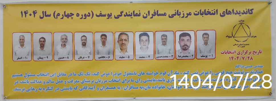 انتخابات دوره چهارم مرزبانی بخش مسافران شعبه یوسُف در تاریخ 28 مهرماه 1404 با حضور دستیار محترم دیدهبان مرزبانی، مسافر سعید اختریان برگزار شد که در انتها افراد ذیل به افتخار خدمت در جایگاه مرزبانی نایل شدند: