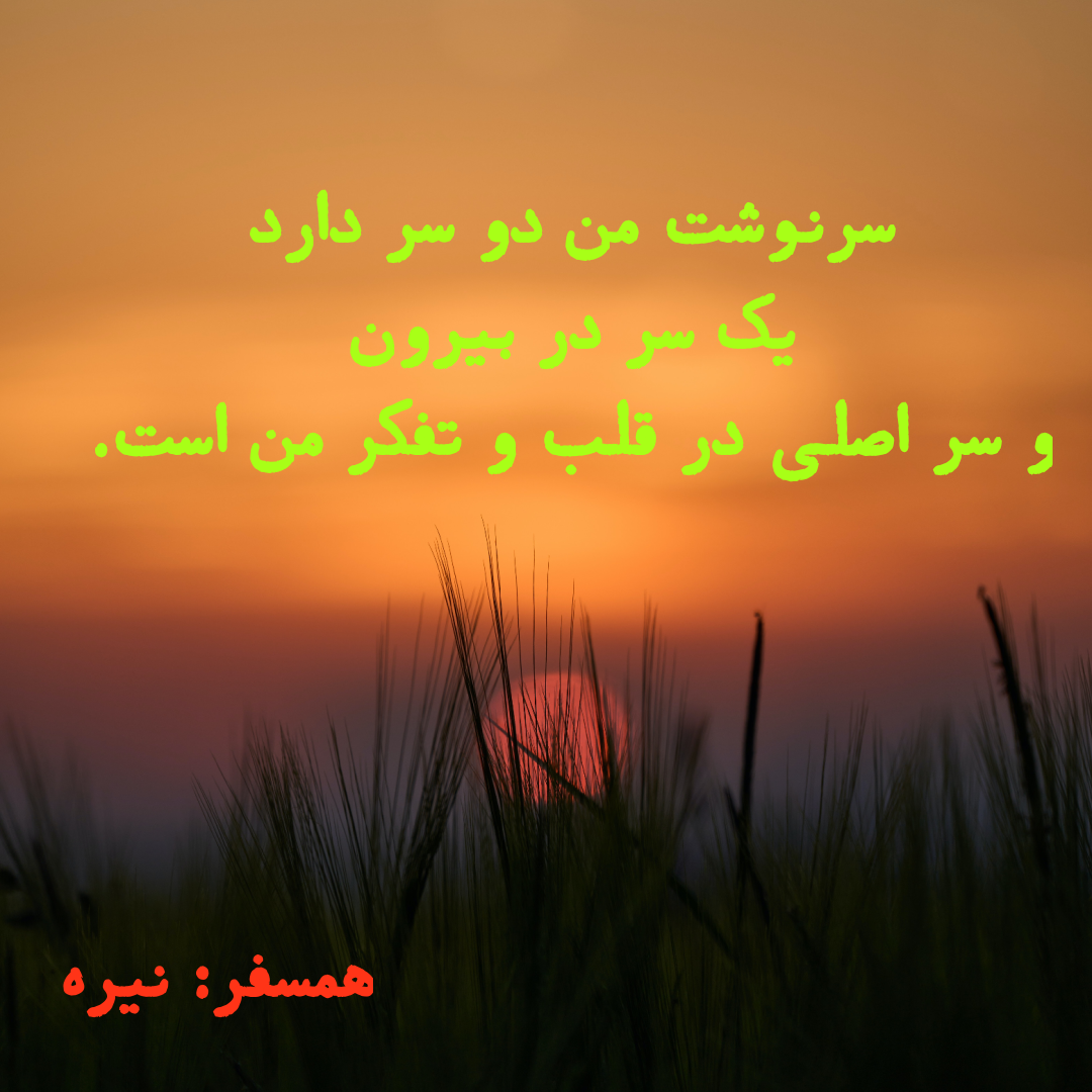 سرنوشت من دو سر دارد؛ یک سر در بیرون و سر اصلی در قلب و تفکر من است. بستر بیرونی، تنها انعکاس آینهوار تمایلات درونی است. این بدان معنا است که اگر درون من، خواستهای برای رهایی و آرامش نباشد، زیباترین و آرامترین محیطها نیز نمیتوانند مرا به تعادل برسانند. این بستر است که به فرمان درونی من، شکل میگیرد و پر و بال مییابد.