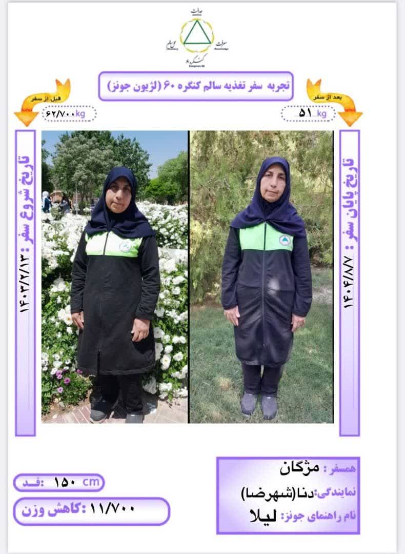 در روز چهارشنبه 7 آبانماه 1404 مسافر تغذیه سالم همسفر مژگان رهجو راهنما همسفر لیلا نمایندگی دنا (شهرضا) با قد 150 وزن اولیه 62/700 کیلوگرم مدت 17ماه و 23 روز به روش DST سفر کردند؛ 11/700 کیلو کاهش وزن داشتند و به وزن 51 کیلو گرم رسیدند و با دستان پر مهر آقای مهندس آزاد و رها شدند.