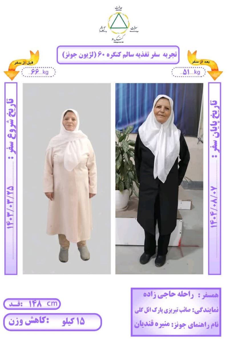 در روز چهارشنبه ۷ آبان ماه ۱۴۰۴ همسفر راحله رهجوی راهنما همسفر منیره نمایندگی صائب تبریزی پارک ائل گلی با قد ۱۴۸ وزن اولیه ۶۶ کیلوگرم به مدت ۱ سال و ۴ ماه و ۱۲ روز به روش DST سفر کردند ۱۵ کیلوگرم کاهش وزن داشتند و به وزن ۵۱ کیلوگرم رسیدند و با دستان پر مهر آقای مهندس آزاد و رها شدند.