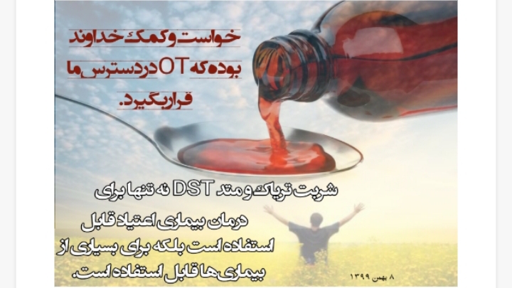 شربت OT یا همان شربت شفا بخش، بهترین داروی بیماران اعتیاد است و بیانگر زندگی دوباره و تولد حس‌های از بین رفته است. همانگونه که با مصرف موادمخدر، تخریب‌های جسم و روان را به خودمان وارد کردیم، با تولد OT، تمام تخریب‌ها بازسازی می‌شود.