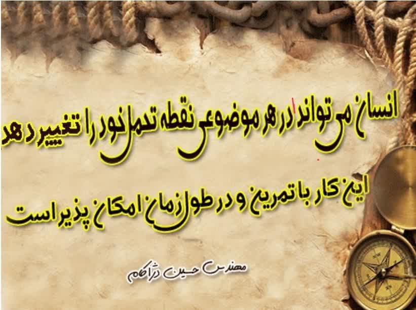 همانگونه که باره شنیده این دو صد گفته چون نیم کردار نیست. من با تمرین و استفاده از آموزشهای و یادگیری بیشتر میتوانم در رسیدن و کامل کردن آن انسانی که رسیدن به تعادل و هدف خود بسیار پیشرفت نمایم. من در متد DST آموختم ذره ذره میتوان دنیا را تغییر داد. من در سی دی حقههای نفس ذره ذره مقاومت کردن در برابر امیال ضدارزشی را آموختم. با در کنار قرار دادن آموزشها میتوانم در مسیر آگاهی و آن چهارچوب که قوانین و حفظ حرمت ها میباشد به تعالی نفس خود پرداخته و انسان مفیدی برای خودم باشم. به امید روزی که لطف قدم برداشتن در مسیر فرمان و دستورات قادر مطلق به درستی برای انسانهای که در دنیای جدید قدم نهاده و به هدف خود میرسند.