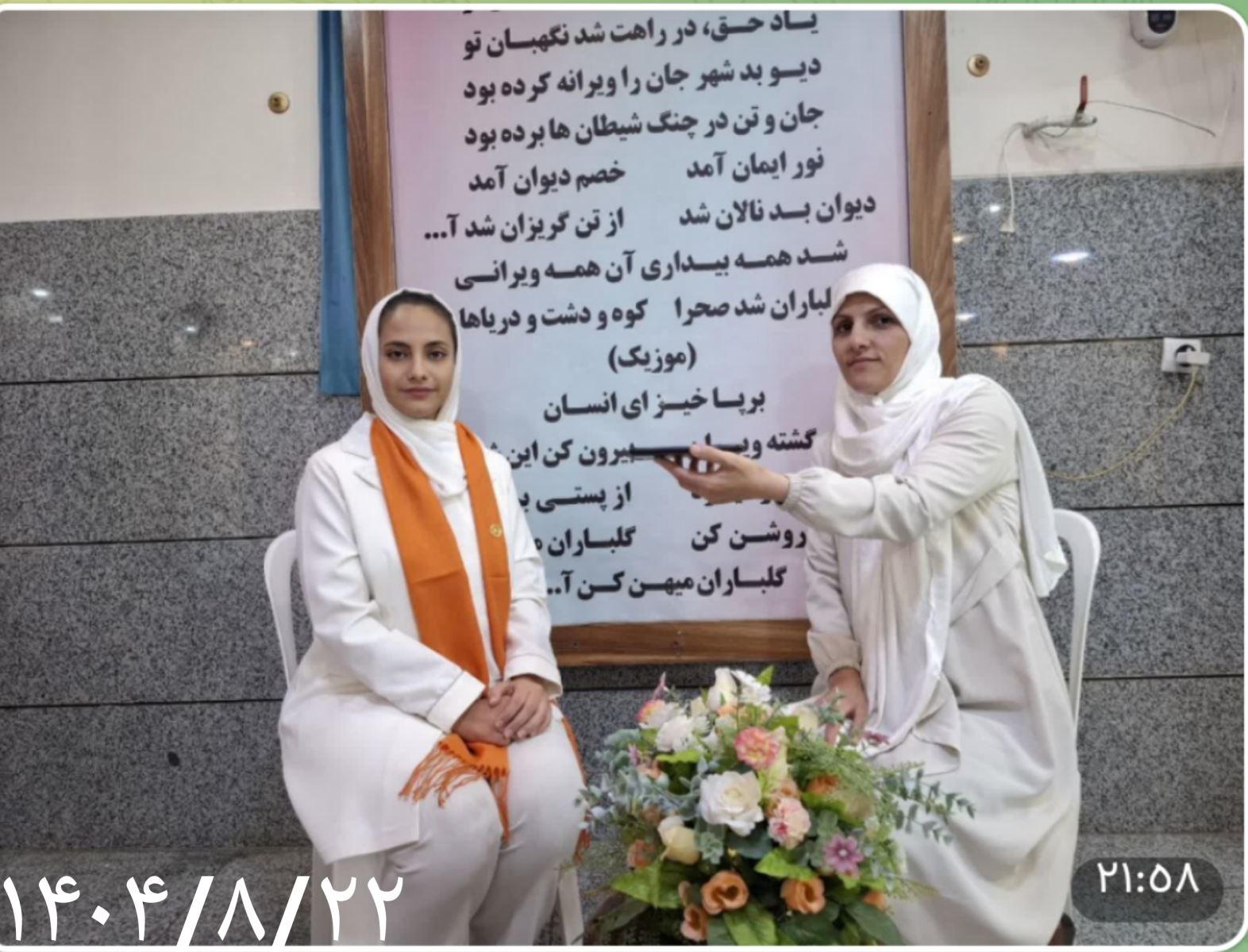 هیچ کلمهای نمیتواند حس آن لحظات من را که در ساختمان سیمرغ بودم توصیف کند حس رهایی، زندگی دوباره، یومالفصل جدید انگار که از یک فصل زندگی عبور کرده و وارد فصل دیگری از زندگی شدم آن لحظات بدون شک بهترین لحظات زندگی من است. مفهوم این شال برای من حرکت در جهت فرامین الهی است این شال هر لحظه به من عهد و پیمانی که بستم را یادآوری میکند قبل از هر تفکر هر کلام و هر عملی که انجام میدهم به من گوشزد میکند که مراقب تفکر کلام و عمل خود باشم تا مبادا از مسیر مستقیم خارج شوم وارد حاشیه شوم و از گردباد کنگره که تمام افراد با عشق و محبت در آن جمع میباشند به بیرون پرتاب شوم.