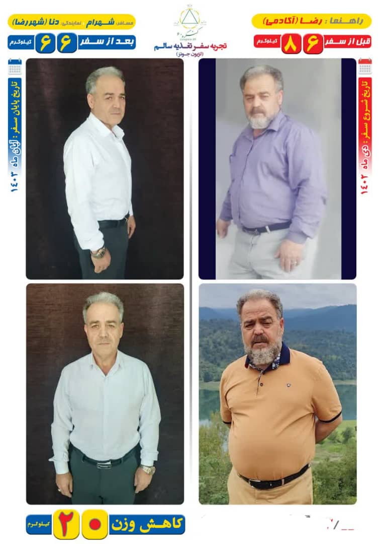 نتیجه این شد که بیماری ایشان رو به سلامتی رفت، اضافه وزن کاهش یافت و امروز خودشان راهنمای تغذیه در نمایندگی شهرضا هستند و یک لژیون خوب با ۱۵ رهجو را مدیریت میکنند. من نیز مرتب به صحبت های هفتگی ایشان گوش می دهم و از حرکت قشنگشان آموزش میگیرم.
