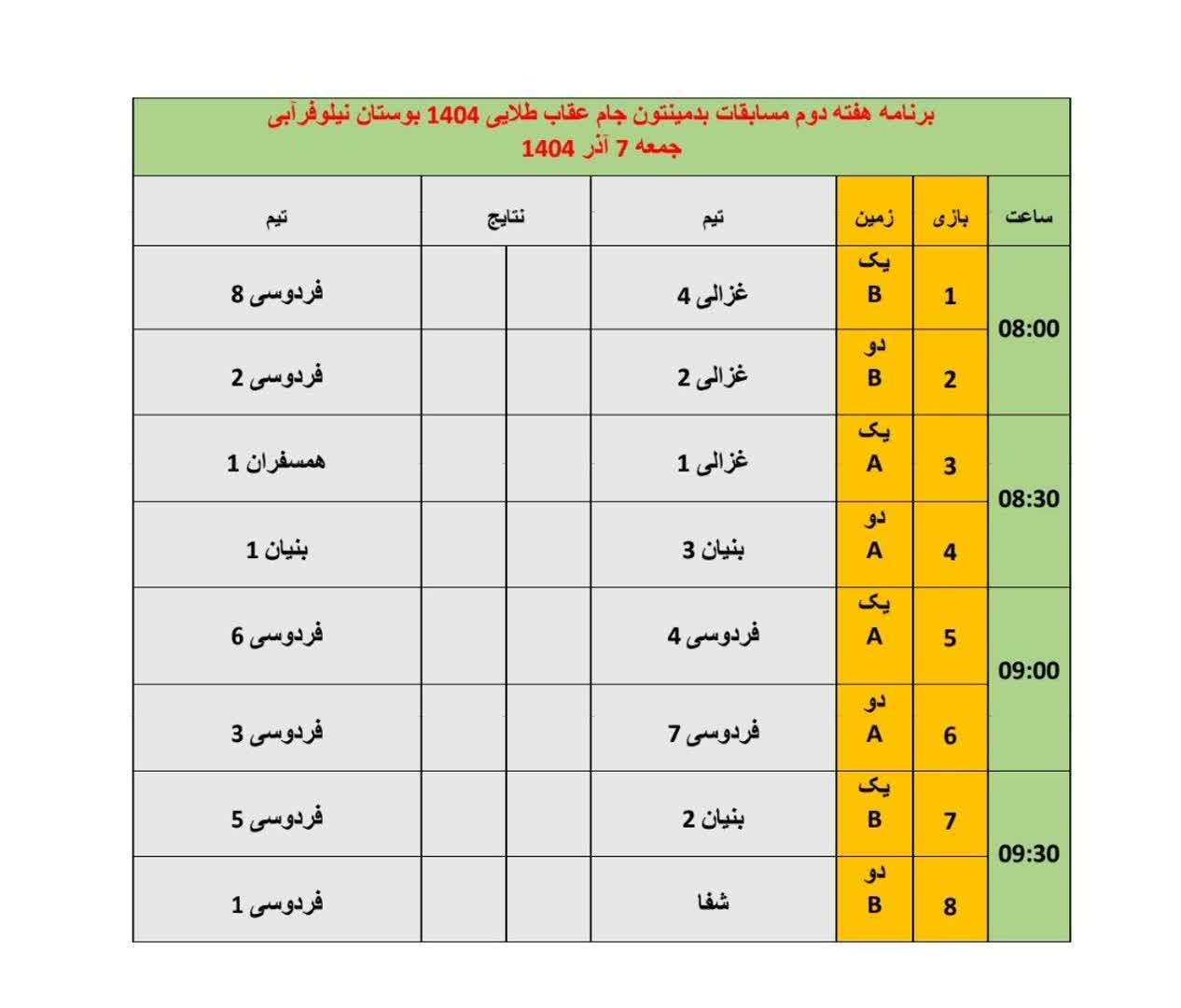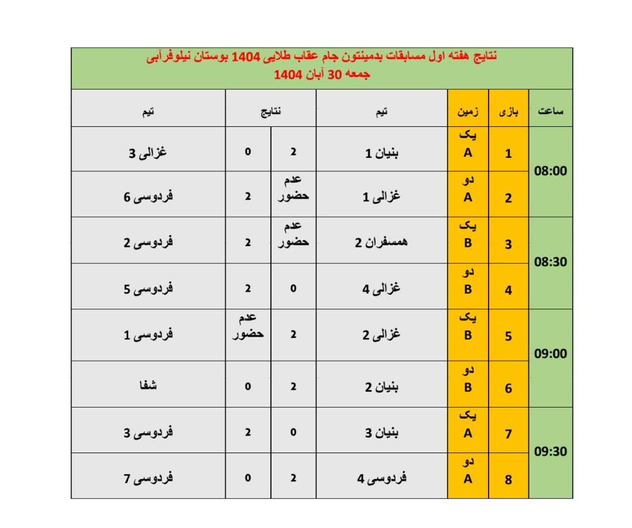 هفته اول مسابقات بدمینتون جام عقاب طلایی 1404 بوستان نیلوفرآبی روز جمعه 30 آّبان با انجام 8 بازی آغاز گردید.