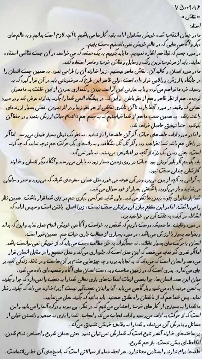 ما در مورد انسان و کالبد آن، نقّاش ماهر نیستیم؛ زیرا خداوند آن را طراحی نمود، به همین جهت انسان را در جایگاه با ارزش و والایی قرار داده است؛ ولی ظاهر این طرح که موضوعاتی باید در آن قرار گیرد که به وسیله خود ما فراهم میگردد و یا به عبارتی این آراسته بودن و نگهداری نمودن از این خلقت به ما محوّل گردیده، هم از نظر ظاهر و هم از نظر باطن؛ و اینکه، در پیشگاه الهی شما را چگونه پندارند عرض شد و در مورد کسانی که وظیفه در مورد آنها دارید تا آن تابلوی نقّاشی از هر نظر زیبا و در اثر نمودن، نقش بسیار ارزندهای داشته باشد؛ به همین سبب ما هم از شما خواستیم که به جسم هم تا اتمام حیات ارزش بنهید و در حفظ آن بکوشید، حتماً توفیق حاصل خواهد شد.
