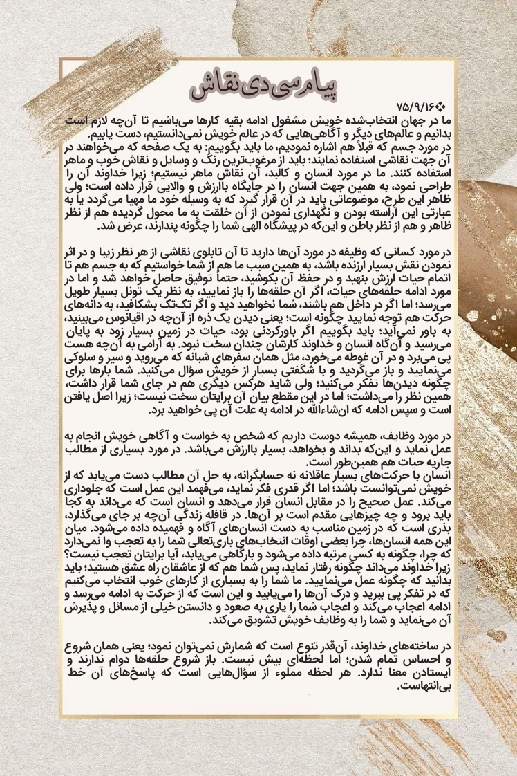 ما در مورد انسان و کالبد آن، نقّاش ماهر نیستیم؛ زیرا خداوند آن را طراحی نمود، به همین جهت انسان را در جایگاه با ارزش و والایی قرار داده است؛ ولی ظاهر این طرح که موضوعاتی باید در آن قرار گیرد که به وسیله خود ما فراهم میگردد و یا به عبارتی این آراسته بودن و نگهداری نمودن از این خلقت به ما محوّل گردیده، هم از نظر ظاهر و هم از نظر باطن؛ و اینکه، در پیشگاه الهی شما را چگونه پندارند عرض شد و در مورد کسانی که وظیفه در مورد آنها دارید تا آن تابلوی نقّاشی از هر نظر زیبا و در اثر نمودن، نقش بسیار ارزندهای داشته باشد؛ به همین سبب ما هم از شما خواستیم که به جسم هم تا اتمام حیات ارزش بنهید و در حفظ آن بکوشید، حتماً توفیق حاصل خواهد شد.