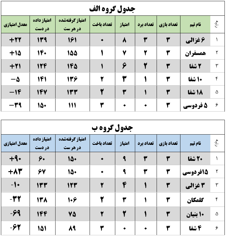 پس از پایان این دیدارها، جدول ردهبندی هردو گروه به شرح زیر اعلام میگردد:
