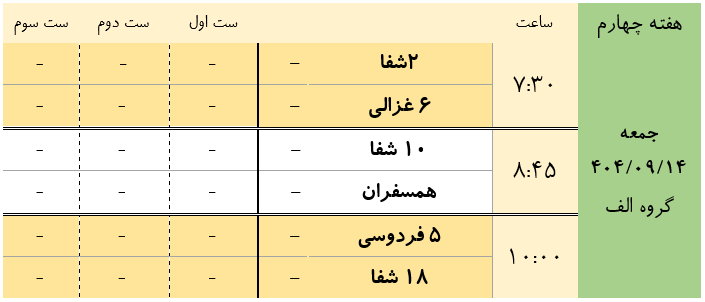 هفته چهارم رقابتهای گروه الف با برگزاری دیدارهای زیر در تاریخ جمعه چهاردهم آذرماه پیگیری خواهد شد: