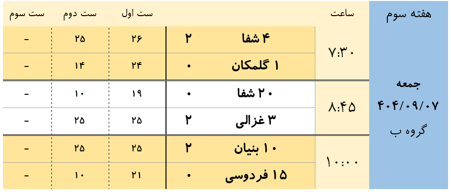 نتایج کامل بازیهای هفته سوم گروه ب در جدول زیر قابل مشاهده است