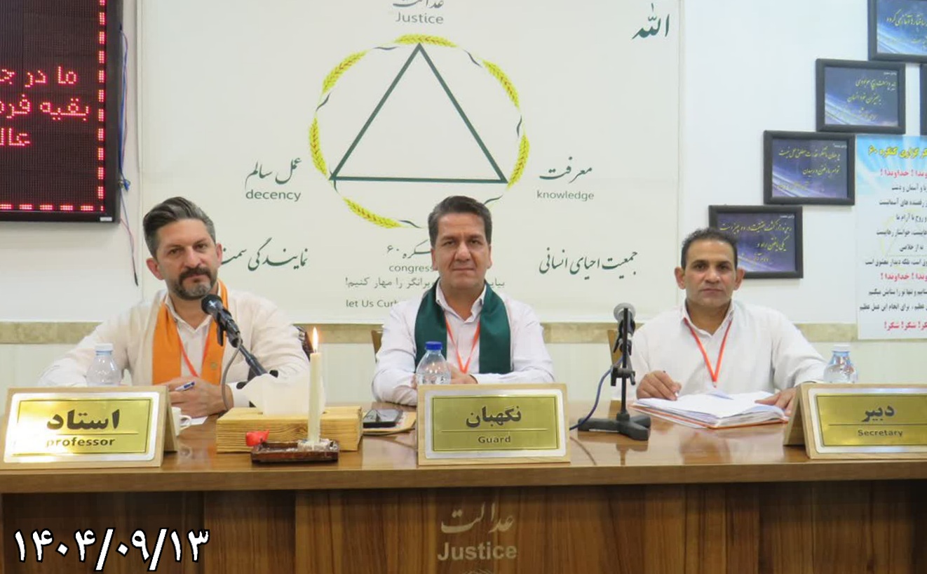 جلسه دوازدهم از دوره پنجاه و هفتم کارگاههای آموزشی عمومی کنگره ۶۰ نمایندگی سمنان، با استادی راهنما مسافر نادر، نگهبانی مسافر مجتبی و دبیری همسفر محسن با دستور جلسه «وادی دهم: صفتگذشته در انسان صادق نیست، چون جاری است» در روز پنجشنبه ۱۳ آذرماه ۱۴۰۴ رأس ساعت ۱۶:۳۰ آغاز به کار نمود.