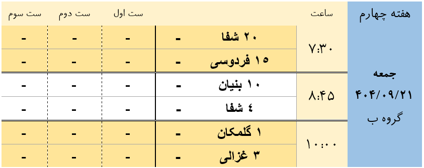هفته چهارم رقابتهای گروه ب نیز با برگزاری دیدارهای زیر در تاریخ جمعه 21 آذرماه پیگیری خواهد شد: