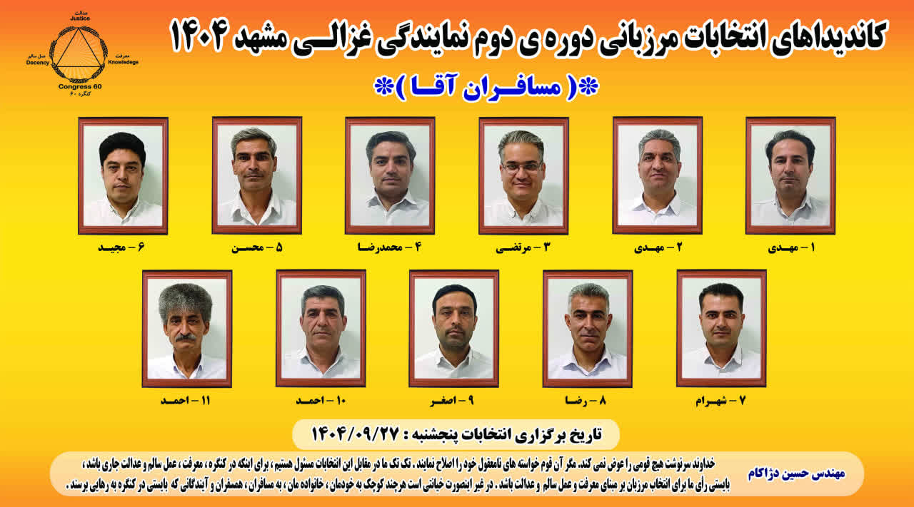 دومین دوره انتخابات مرزبانی مسافران نمایندگی غزالی مشهد، روز پنج شنبه 27 آذر ماه ۱۴۰۴ رأس ساعت 15:00 در محل نمایندگی برگزار میگردد.