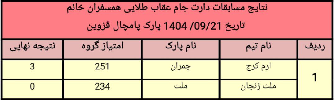 نتایج مسابقات دارت جام عقاب طلایی همسفران خانم کنگره۶۰ در روز جمعه ۱۴۰۴/۰۹/۲۱ در پارک پامچال قزوین