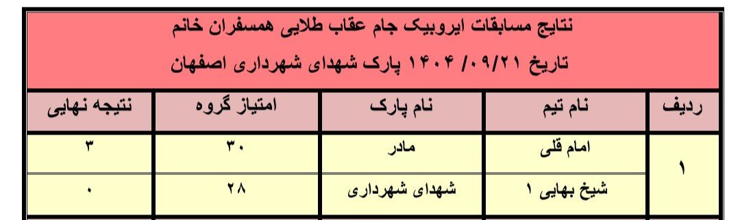 نتایج مسابقات ایروبیک آمادگی جسمانی جام عقاب طلایی همسفران خانم کنگره۶۰ در روز جمعه ۱۴۰۴٫۰۹٫۲۱ پارک شهدای شهرداری اصفهان