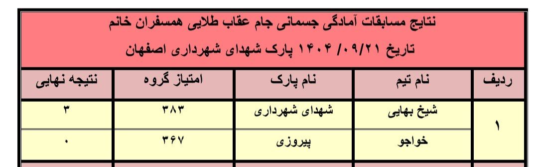 نتایج مسابقات ایروبیک آمادگی جسمانی جام عقاب طلایی همسفران خانم کنگره۶۰ در روز جمعه ۱۴۰۴٫۰۹٫۲۱ پارک شهدای شهرداری اصفهان