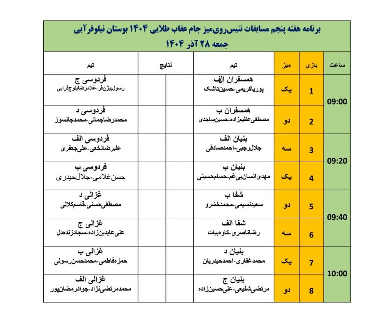 در ادامه این رقابتها جمعه 28 آذر ماه ۱۴۰۴ هفته پنجم با انجام ۸ بازی دیگر پیگیری میگردد.