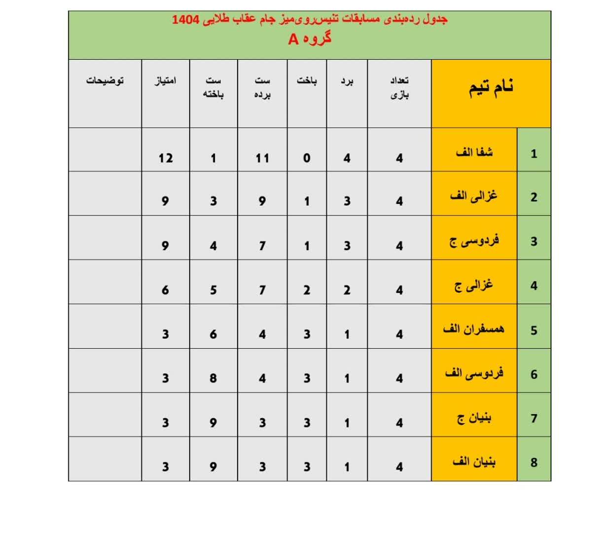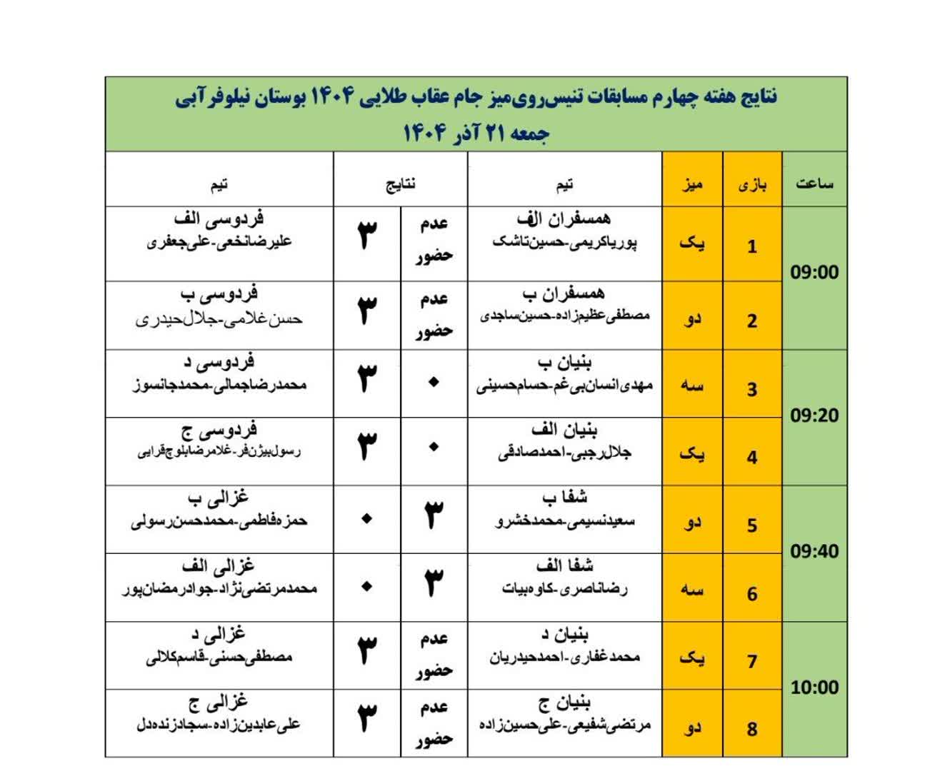 روز جمعه 21 آذر ماه هفته چهارم مسابقات تنیسرویمیز جام عقاب طلایی در بوستان نیلوفرآبی با انجام ۸ بازی پیگیری و نتایج طبق جدول زیر بدست آمد.